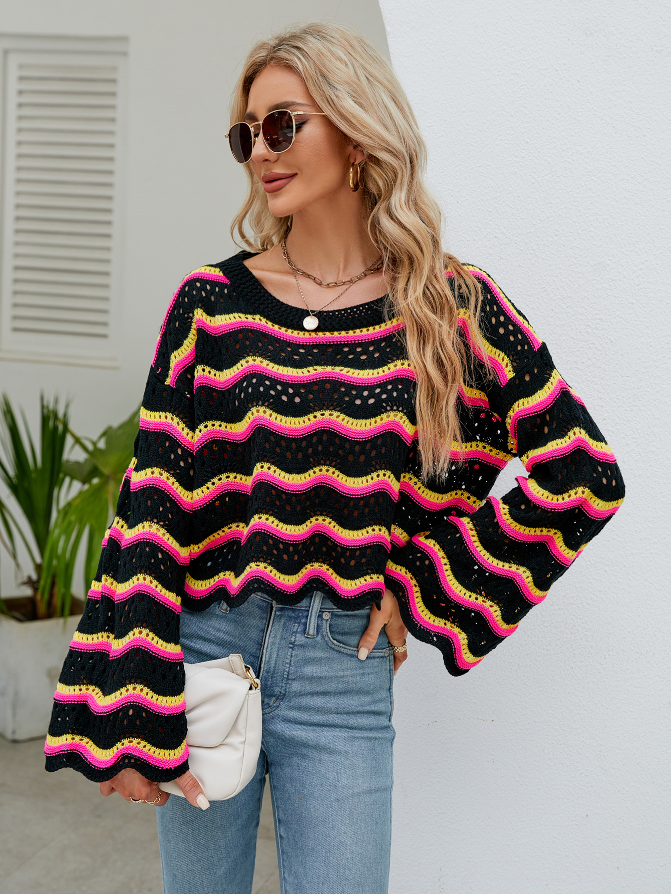 NŐI HOSSZÚ UJJÚ, KEREK NYAKÚ ÚJ STÍLUSÚ KÖTÖTT CSÍKOS PULÓVER